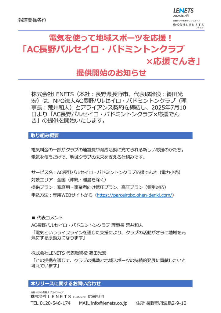 運営法人 | NPO法人AC長野パルセイロ・バドミントンクラブ |