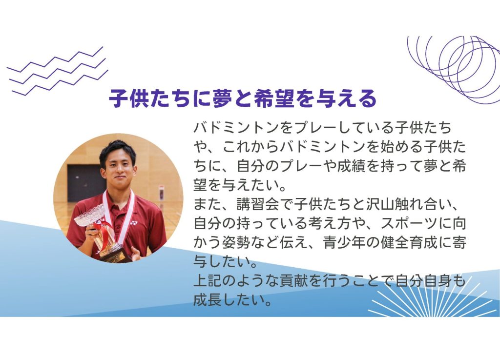先生方や町の方々、支えて来る方々の喜んでくれる姿を見て自分の嬉びに気が付く。この経験から自分が「バドミントンで活躍する」ことで恩返しや感動元気を届ける力にしている。