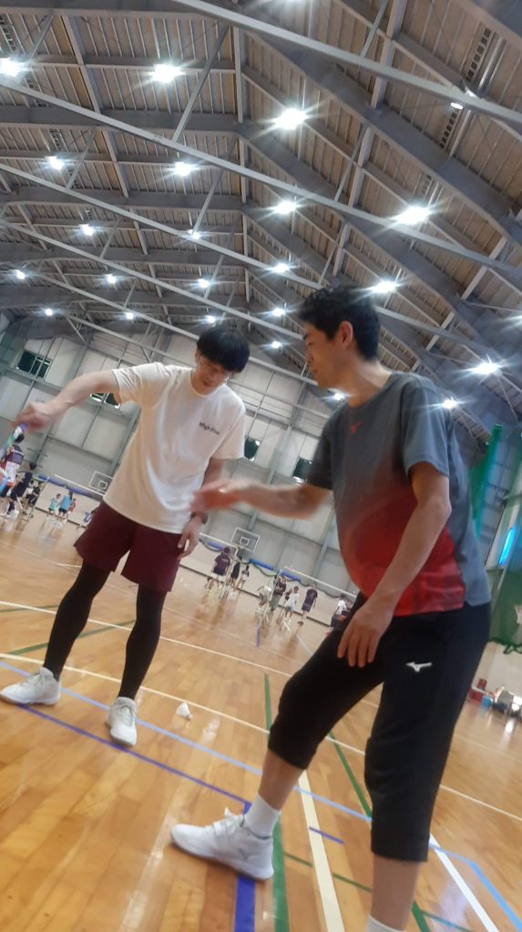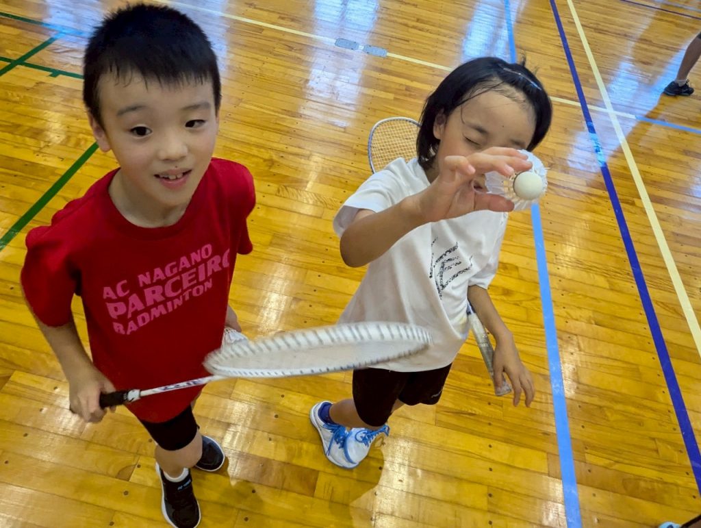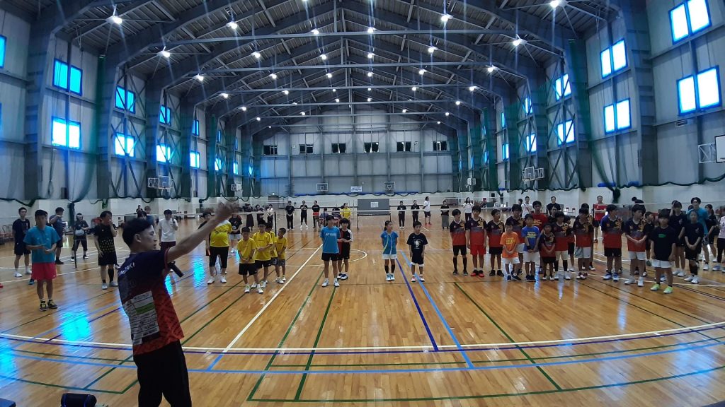 朝晩は高原の涼しさも日中の体育館は暑いです。2日間とも早朝から標高1,500mの高地に集合し、参加者は元気よく楽しく上達するための指導を受けました。