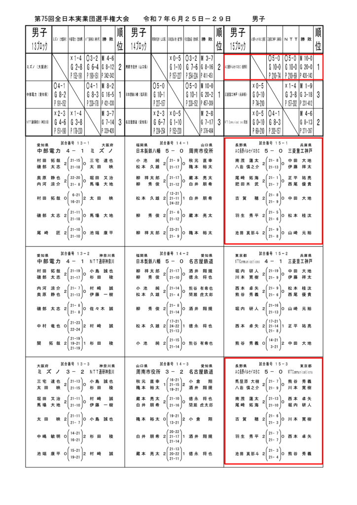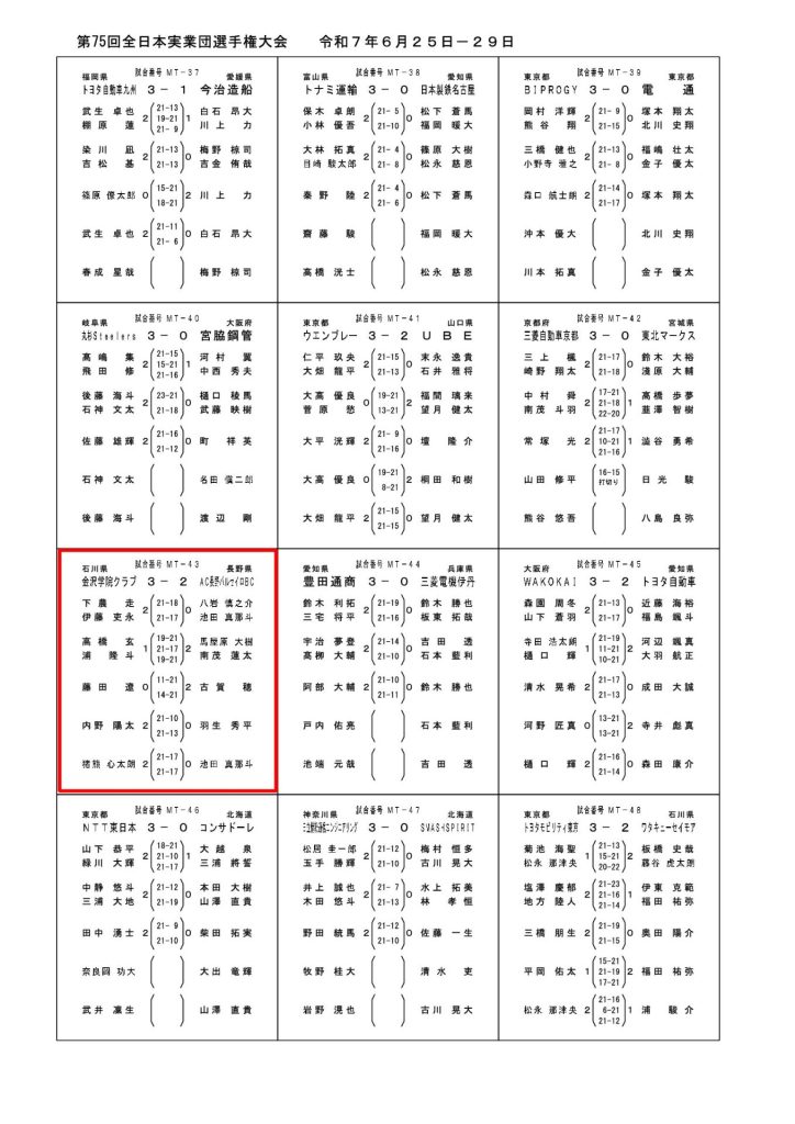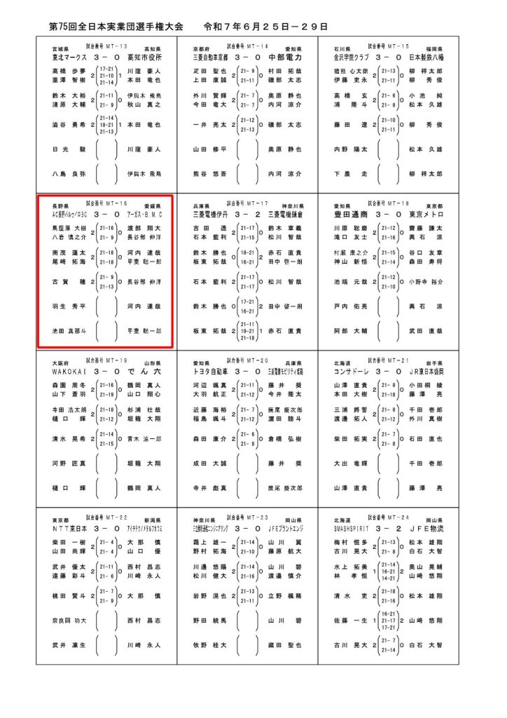 [2025.06.25-29]第75回全日本実業団大会 愛媛県松山大会・試合結果 2025.06.29 最終更新日時 : 2025.07.22 parbad_admin2023_tdrag37m 全てのリザルトPDF 日本実業団バドミントン連盟 公式ホームページ 写真ギャラリー